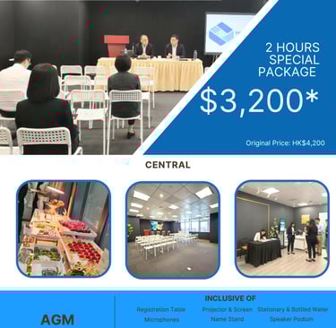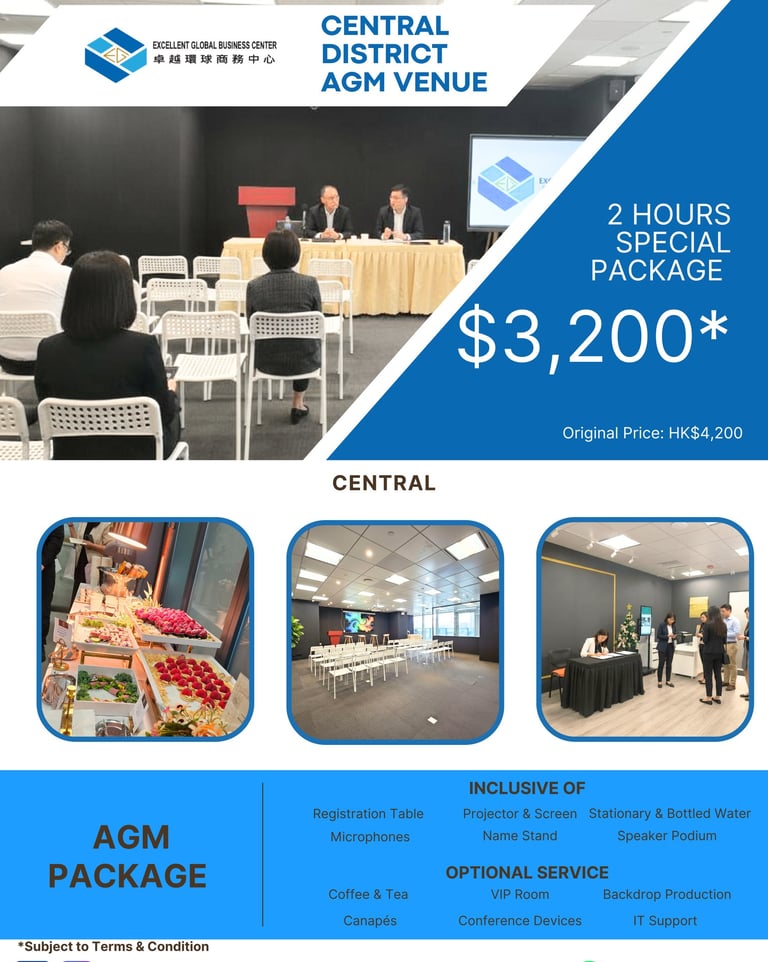 Our team provides professional advice and support to ensure your meeting runs seamlessly and complies with all regulations. We are delighted to introduce our all-inclusive AGM/EGM package at our new flagship conference venue in Central, designed to support your meeting with convenience, professionalism, and compliance.